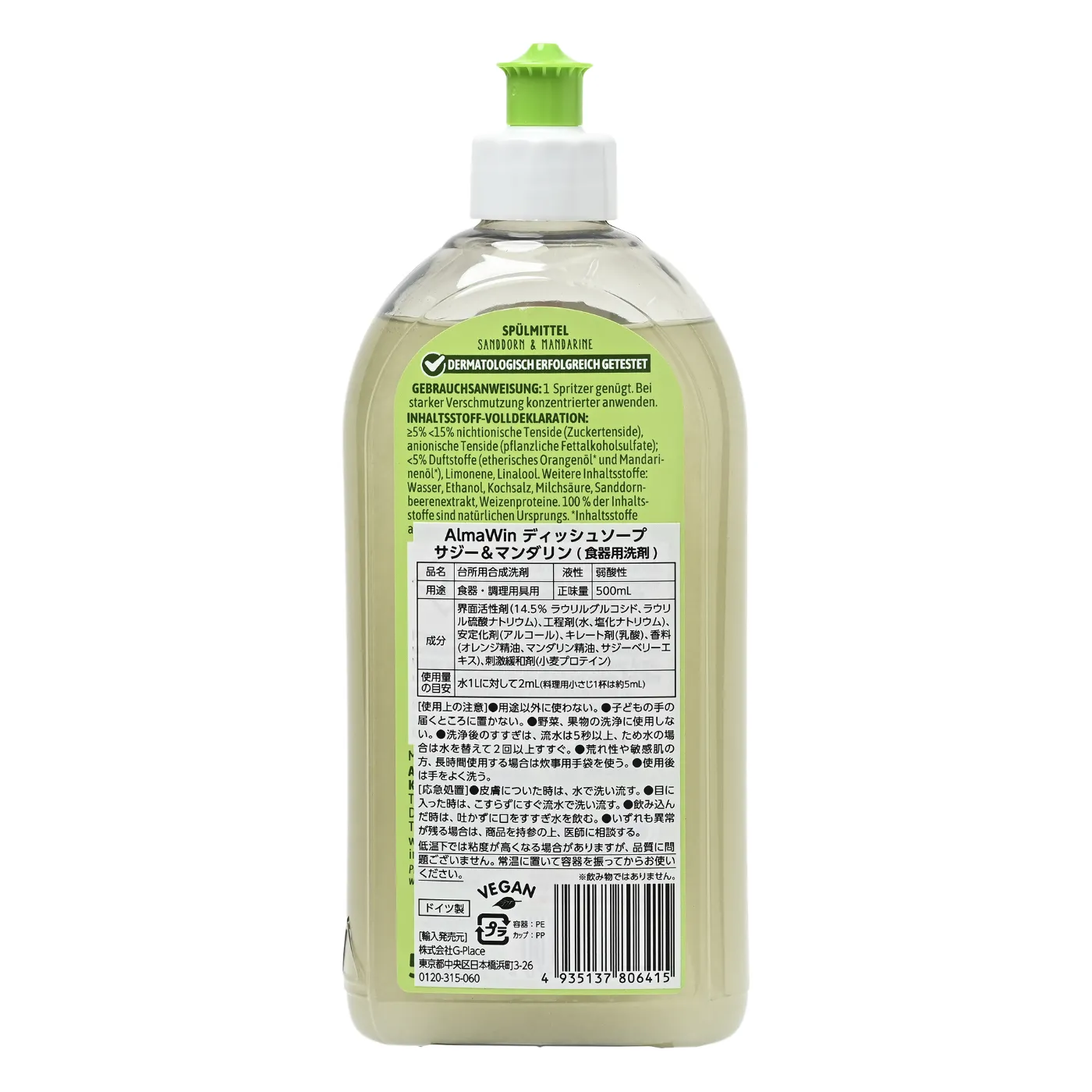 界面活性剤(14.5% ラウリルグルコシド、ラウリル硫酸ナトリウム)、工程剤(水、塩化ナトリウム)、安定化剤(アルコール)、キレート剤(乳酸)、香料(オレンジ精油、マンダリン精油、サジーベリーエキス)、刺激緩和剤(小麦プロテイン)
